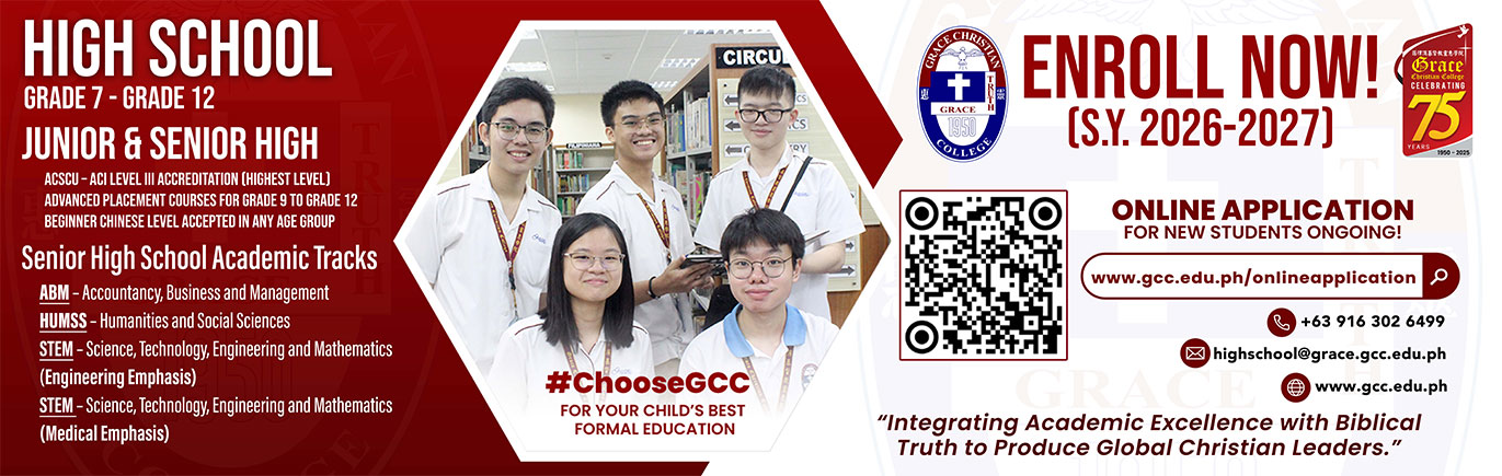 Please email elementary@grace.gcc.edu.ph with the subject line “NEW STUDENT APPLYING FOR GRADE __” and include the child’s complete name, contact information (email and landline/mobile), parent’s name, previous school, and previous level.