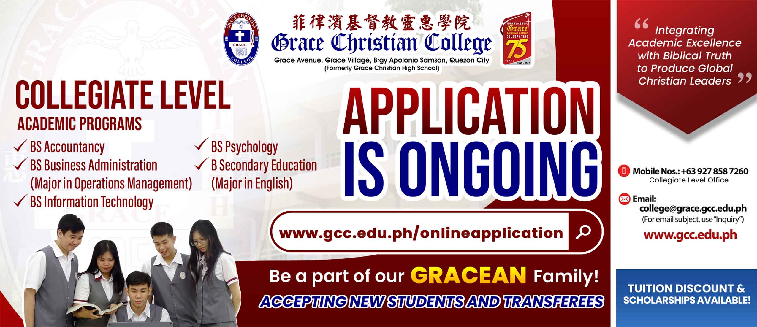 2. The Bachelor in Secondary Education is an undergraduate program that prepares students to become high school teachers in their chosen subjects. Besides meeting the standard requirements set by the Commission on Higher Education (CHED), GCC also offers courses that promote Christian values and appreciation of Chinese culture.