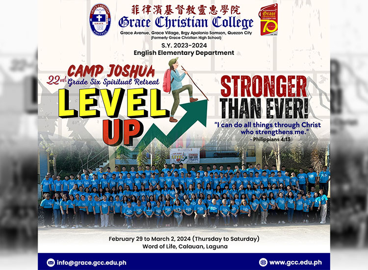 Praise God for the 22nd GCC Camp Joshua of Grace Christian College Grade 6 students held from February 29 to March 2, 2024 at the Word of Life Camp in Laguna.